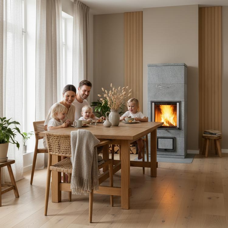 Sanfte Wärme, die sich anfühlt wie eine warme Umarmung. Wenn das Goldene Feuer im Feuerraum entfacht wird, erfüllt es Ihr Zuhause mit Licht und sanfter, angenehmer Wärme. Wenn die Flammen langsam zur Ruhe kommen, verschwindet die Wärme nicht,der Mammutti-Speckstein gibt sie noch am nächsten Tag als weiche, natürliche Strahlungswärme ab.